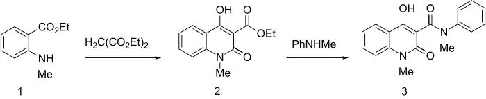 Ethyl 2-(methylamino)benzoate is condensed with ethyl malonate. Amine-ester interchange of that compound with N-methylaniline results in formation of the amide linomide.