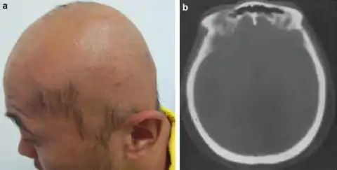 a) Clinical manifestation of condition. b CT scan showing thickening scalp | |