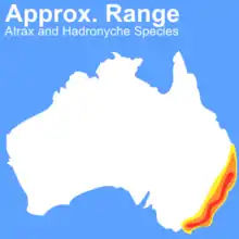 A. robustus is one of three designated species of the genus Atrax (the others being A. yorkmainorum and A. sutherlandii).[11][12] The related genus Hadronyche is represented by about 40 other dangerous species in eastern Australia, including Queensland and Tasmania. The males in this case have somewhat more potent venom than females and they also wander, making them more likely to be encountered in summer. Bites by males of two large species, the Sydney funnel-web and northern tree funnel-web, have resulted in death.[13] One specific case denoted an individual being bitten on the heel through his leather footwear after provoking the spider, indicating the great strength of the spider's chelicerae.