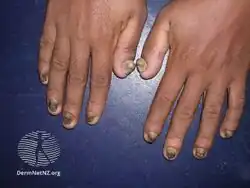 - ↑ Berker, David de (2019). "20. Diseases of the nails". In Morris-Jones, Rachael (ed.). ABC of Dermatology (7th ed.). Hoboken: Wiley Blackwell. p. 168. ISBN 978-1-119-48899-6. Archived from the original on 2023-07-01. Retrieved 2023-06-05.