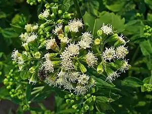Ageratina altissima | White snakeroot | Root tea has been used to treat diarrhea, kidney stones, and fever. A root poultice can be used on snakebites. The smoke from burning leaves is used to revive unconscious people.[8] The plant contains the toxin tremetol which causes milk sickness, a sometimes fatal condition.[9] | ![]() |