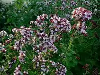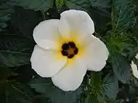 Alcea rosea | Common hollyhock | Believed to be an emollient and laxative. It is used to control inflammation, to stop bedwetting and as a mouthwash in cases of bleeding gums.[10] | ![]() |
