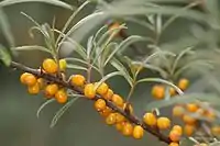 Hippophae rhamnoides | Sea buckthorn | The leaves are used as herbal medicine to alleviate cough and fever, pain, and general gastrointestinal disorders as well as to cure dermatologic disorders. Similarly, the fruit juice and oils can be used in the treatment of liver disease, gastrointestinal disorders, chronic wounds or other dermatological disorders.[86] | ![]() |