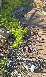 According to a study by the Dutch organization VROM, 80% of people claim that "everybody leaves a piece of paper, tin or something, on the street behind".[11] Young people from 12 to 24 years cause more litter than the average (Dutch or Belgian) person; only 18% of people who regularly cause litter were 50 years of age or older. However, a 2010 survey of littering in Maine, New Hampshire and Vermont in the United States, placed litterers aged 55 and over at less than 5%. The same observational study estimated that 78% of litterers are male.[9] Litter organizations, such as Keep America Beautiful affiliates, Keep Northern Ireland Beautiful, and the Bay Area Stormwater Management Agencies Association, have focused educational efforts on youth littering.[12][13] [14] Negligent or lenient law enforcement contributes to littering behavior. Other causes are inconvenience, entitlement and economic conditions. A survey of dumping in Pennsylvania found that the largest number of illegal dumps were in townships without municipal trash hauling.[15] The same report also cites unavailability of curbside trash and recycling service, shortage of enforcement, and habit as possible causes.[16] The presence of litter invites more littering.[17]