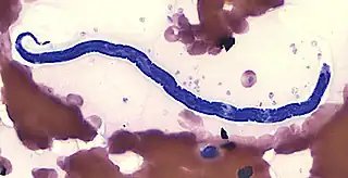 • Top:Loa loa microfilaria in thin blood smear (Giemsa stain)