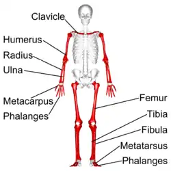 The long bone category includes the femora, tibiae, and fibulae of the legs; the humeri, radii, and ulnae of the arms; metacarpals and metatarsals of the hands and feet, the phalanges of the fingers and toes, and the clavicles or collar bones. The long bones of the human leg comprise nearly half of adult height. The other primary skeletal component of height are the vertebrae and skull.