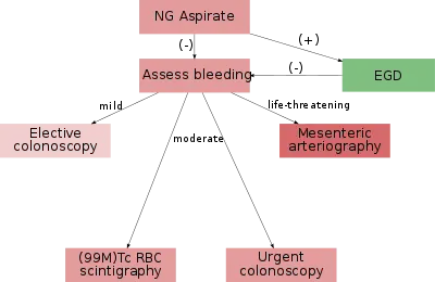 Diagnostic evaluation must be performed after patients have been adequately resuscitated. If an upper GI source is suspected, an upper endoscopy should be performed first. Lower gastrointestinal series evaluation can be performed with anoscopy, flexible sigmoidoscopy, colonoscopy, rarely barium enema, and various radiologic studies.[6]