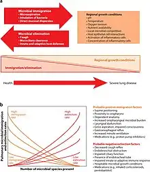 The lung microbiota is the pulmonary microbial community consisting of a complex variety of microorganisms found in the lower respiratory tract particularly on the mucous layer and the epithelial surfaces. These microorganisms include bacteria, fungi, viruses and bacteriophages. The bacterial part of the microbiota has been more closely studied. It consists of a core of nine genera: Prevotella, Sphingomonas, Pseudomonas, Acinetobacter, Fusobacterium, Megasphaera, Veillonella, Staphylococcus, and Streptococcus.[1][2][3] They are aerobes as well as anaerobes and aerotolerant bacteria. The microbial communities are highly variable in particular individuals and compose of about 140 distinct families. The bronchial tree for instance contains a mean of 2000 bacterial genomes per cm2 surface. The harmful or potentially harmful bacteria are also detected routinely in respiratory specimens. The most significant are Moraxella catarrhalis, Haemophilus influenzae, and Streptococcus pneumoniae. They are known to cause respiratory disorders under particular conditions namely if the human immune system is impaired. The mechanism by which they persist in the lower airways in healthy individuals is unknown.
