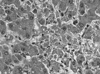 LCMV causes callitrichid hepatitis[8] in New World primates. The onset of the infection is nonspecific and may include fever, anorexia, dyspnea, weakness and lethargy. Jaundice is characteristic and petechial hemorrhages may develop.[8] Prostration and death usually follow.[8]Necropsy lesions in primates with callitrichid hepatitis show signs of jaundice, hepatomegaly, splenomegaly, and subcutaneous and intramuscular hemorrhages.[8] Pleural and pericardial effusion, sometimes sanguineous, has also been reported.[8] On histology, multifocal necrosis with acidophilic bodies and mild inflammatory infiltrates are typically found in the liver.[8]