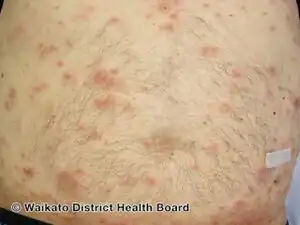 Presentation entails skin lesions such as -erythematous, macules, papules.The condition also affects the lungs, hence cough, shortness of breath is present.[5]