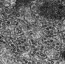 MRC-5 (Medical Research Council cell strain 5) is a diploid cell culture line composed of fibroblasts, originally developed from the lung tissue of a 14-week-old aborted Caucasian male fetus.[1][2] The cell line was isolated by J.P. Jacobs and colleagues in September 1966 from the seventh population doubling of the original strain, and MRC-5 cells themselves are known to reach senescence in around 45 population doublings.[2][3][4]
