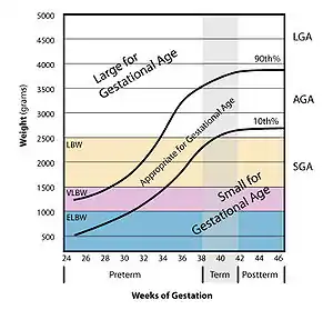 Large for gestational age (LGA) is a term used to describe infants that are born with an abnormally high weight, specifically in the 90th percentile or above, compared to other babies of the same developmental age.[1][2][3] Macrosomia is a similar term that describes excessive birth weight, but refers to an absolute measurement, regardless of gestational age.[4] Typically the threshold for diagnosing macrosomia is a body weight between 4,000 and 4,500 grams (8 lb 13 oz and 9 lb 15 oz), or more, measured at birth, but there are difficulties reaching a universal agreement of this definition.[4]