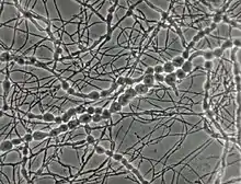 Although conidiation (conidium), a form of asexual reproduction, in M. mycetomatis is rare, two main types can be described in-vitro. In the first type oval to pyriform conidia, 3 to 5 μm can be observed. The conidia have truncated bases and are on the tips of simple or branched conidiophores. In-vitro, this type of conidiation can be observed in 50% of cultures on soil extract, hay infusion or water agar.[7] When grown on potato carrot agar or cornmeal agar the second type of conidiation is observed. This type is characterized by small spherical conidia (3 μm in diameter) on tapered tips of flask shaped phialides and collarettes.[6][11] On SDA media M. mycetomatis is sterile.[2][7] No sexual stage has been identified for M. mycetomatis.[4]