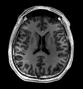 ![]() Cross-sectional T1-weighted MRI of a healthy human brain acquired with an ultra high-field MR of 7 Tesla field strength | |