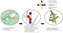 There are 15 aphid species that can non-persistently transmit MDMV.[10] The aphids mainly feed on the family Poaceae.[11] MDMV overwinters in alternate hosts. These hosts range is sorghum, maize, and Johnson grass. Symptoms appear six weeks after aphids feed and transmit the virus. The aphid acquires the virus within seconds of feeding on an infected plant, either maize, Johnson grass, or sorghum.[7] There is no latent period for transmission to new host plants.[5] After acquiring MDMV an aphid is able to transmit the virus within 15–30 minutes.[7] Aphids do not retain MDMV after molting.[5]