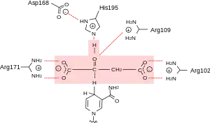 Mechanistically, malate dehydrogenase catalyzes the oxidation of the hydroxyl group of malate by utilizing NAD+ as an electron acceptor. This oxidation step results in the elimination of a proton and a hydride ion from the substrate. NAD+ receives the hydride ion (specifically, the hydride ion is transferred to the nicotinamide ring of the NAD+) and becomes reduced to NADH while concomitantly, the His-195 residue on the enzyme accepts the proton.[11] The positively charged His-195 residue, which is involved in base catalysis of the substrate, is stabilized by the adjacent, negatively charged Asp-168 residue. This electrostatic stabilization helps facilitate the transfer of the proton.[1] Arg-102, Arg-109, and Arg-171 (which are protonated, and thus positively charged) participate in electrostatic catalysis and help to bind the negatively charged carboxylates on the substrate. Additionally, the Arginine residues on the enzyme provide additional substrate specificity and binding through hydrogen bonding between the guanidinium side chain of the Arginine amino acid residues and the carboxylates of the substrate.[12]