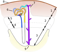Structurally, the cortex consists of cortical labyrinth and medullary rays.[9] The cortical labyrinth contains interlobular arteries, vascular networks formed by afferent and efferent arterioles, renal corpuscles, proximal convoluted tubules, macula densa, distal convoluted tubules, connecting tubules and the initial parts of the collecting ducts.[72] The proximal convoluted tubules predominate in the cortical labyrinth.[73] The continuous layer of the cortex lying above the medullary rays is called the cortex corticis.[9] Cortex corticis differs from the rest of the cortical labyrinth in that it doesn't contain glomeruli.[74][75] Some mammals (for example, pig) have nephrons whose loops of Henle do not reach the medulla; such nephrons are called cortical nephrons.[68][76] Cortical nephrons have a very short thin segment of the loop of Henle, and this segment may even be absent.[76] The medullary rays of the cortex contain the proximal straight tubules, the cortical part of the thick ascending limb of the loops of Henle, and the cortical part of the collecting ducts.[72] The cortex is divided into lobules, each of which is a medullary ray in conjunction with connected to it nephrons, and interlobular arteries that pass between the lobules.[77]