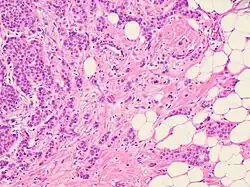 Histopathology of invasive carcinoma of no special type, H&E stain, intermediate magnification. It shows typical plump tumor nests (rather than the single-file linear pattern of invasive lobular carcinoma). The presence of tumor nests in adipose tissue at right in image strongly favors invasiveness.