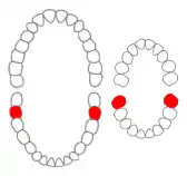In the universal system of notation, the permanent mandibular second molars are designated by a number. The right permanent mandibular second molar is known as "31", and the left one is known as "18". In the Palmer notation, a number is used in conjunction with a symbol designating in which quadrant the tooth is found. For this tooth, the left and right second molars would have the same number, "7", but the right one would have the symbol, "┐", underneath it, while the left one would have, "┌". The international notation has a different numbering system from the previous two, and the right permanent mandibular second molar is known as "47", and the left one is known as "37".