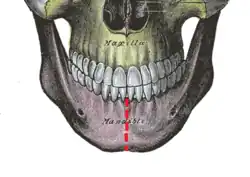 ![]() Anterior view of mandible, showing mandibular symphysis (red broken line) | |