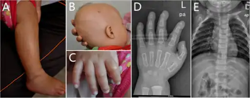 a) Swelling on lower limb b) decreased scalp hair c)mild contractures of hands d & e) X-ray findings show acro-osteolysis | |