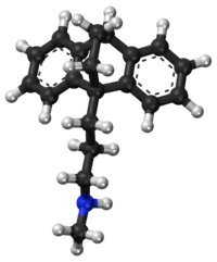 Maprotiline is a tetracyclic compound and is grouped with the TeCAs.[14][13] Its chemical name is N-methyl-9,10-ethanoanthracen-9(10H)-propylamine.[29] The drug has a dibenzobicyclo[2.2.2]octadiene (9,10-dihydro-9,10-ethanoanthracene) ring system; that is, a tricyclic anthracene ring system with an ethylene bridge across the central ring.[14][13] This results in it having a unique three-dimensional central ring (a bicyclo[2.2.2]octane or 1,4-endoethylenecyclohexane ring) and being a tetracyclic rather than a tricyclic compound.[14] However, it could also or alternatively be considered to be a tricyclic and hence a TCA.[13] In addition to its heterocyclic ring system, maprotiline has an alkylamine side chain attached similarly to other TCAs (but notably unlike other TeCAs).[14][13] In terms of the side chain, it is a secondary amine,[13] and its chemical structure, aside from the ethylene link in the central ring, is similar to that of secondary amine TCAs like nortriptyline and protriptyline.[14][29] In accordance, the pharmacology of maprotiline is very similar to that of secondary amine TCAs.[14][13]