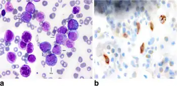 Mast cell leukemia is an extremely aggressive subtype of acute myeloid leukemia that usually occurs de novo but can, rarely, evolve from transformation of chronic myeloid leukemia into the more aggressive acute myeloid leukemia. In a small proportion of cases, acute mast cell leukemia may evolve from a more progressive form of systemic mastocytosis. The diagnosis of acute mast cell leukemia by the WHO criteria includes the requirement for a prevalence of 20% neoplastic mast cells in marrow and 10% in blood.[1] If the mast cells represent less than 10% of blood cells, the tumor is called "aleukemic" mast cell leukemia.