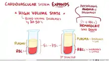 During pregnancy the plasma volume increases by 40-50% and the red blood cell volume increases only by 20–30%.[20] These changes occur mostly in the second trimester and prior to 32 weeks gestation.[22] Due to dilution, the net result is a decrease in hematocrit or hemoglobin, which are measures of red blood cell concentration. Erythropoietin, which stimulates red blood cell production, increases throughout pregnancy and reaches approximately 150 percent of their pregnancy levels at term.[22] The slight drop in hematocrit or hemoglobin is most pronounced at the end of the second trimester and slowly improves when reaching term.[22]