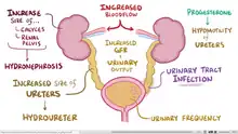 Progesterone causes many changes to the genitourinary system. A pregnant woman may experience an increase in the size of the kidneys and ureter due to the increase blood volume and vasculature. Later in pregnancy, the woman might develop physiological hydronephrosis and hydroureter, which are normal.[31] Progesterone causes vasodilatation and increased blood flow to the kidneys, and as a result glomerular filtration rate (GFR) commonly increases by 50%, returning to normal around 20 weeks postpartum.[20] The increased GFR increases the excretion of protein, albumin, and glucose. The increased GFR leads to increased urinary output, which the woman may experience as increased urinary frequency. Progesterone also causes decreased motility of the ureters, which can lead to stasis of the urine and hence an increased risk of urinary tract infection.[6]