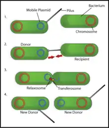 A mating bridge is different from a sex pilus, which is a structure made by an F+ strain bacterium in bacterial conjugation. The pili (plural) act as attachment sites that promote the binding of bacteria to each other. In this way, an F+ strain makes physical contact with an F− strain. Once contact is made, the pili shorten and thereby draw the donor and recipient cells closer together. A conjugation bridge is then formed between the two cells, which provides a passageway for DNA transfer.[1]