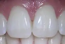The maxillary central incisor is a human tooth in the front upper jaw, or maxilla, and is usually the most visible of all teeth in the mouth. It is located mesial (closer to the midline of the face) to the maxillary lateral incisor. As with all incisors, their function is for shearing or cutting food during mastication (chewing). There is typically a single cusp on each tooth, called an incisal ridge or incisal edge. Formation of these teeth begins at 14 weeks in utero for the deciduous (baby) set and 3–4 months of age for the permanent set.[1][2]