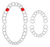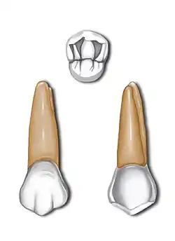 The maxillary first premolar is one of two teeth located in the upper jaw, laterally (away from the midline of the face) from both the maxillary canines of the mouth but mesial (toward the midline of the face) from both maxillary second premolars. The function of this premolar is similar to that of canines in regard to tearing being the principal action during mastication, commonly known as chewing. There are two cusps on maxillary first premolars, and the buccal (closest to the cheek) cusp is sharp enough to resemble the prehensile teeth found in carnivorous animals. There are no deciduous maxillary premolars. Around 10-11 years of age, the primary molars are shed and the permanent premolars erupt in their place. It takes about 3 years for the adult premolar and its root to fully calcify. Due to its long buccal root with narrow root canal and short palatal root with wide root canal, the upper 1st premolar is very prone to fracture during exodontia, hence, it is sometimes referred to some dentists as the "King of Fracture". In the universal system of notation, the permanent maxillary premolars are designated by a number. The right permanent maxillary first premolar is known as "5", and the left one is known as "12". In the Palmer notation, a number is used in conjunction with a symbol designating in which quadrant the tooth is found. For this tooth, the left and right first premolars would have the same number, "4", but the right one would have the symbol, "┘", underneath it, while the left one would have, "└". The international notation has a different numbering system than the previous two, and the right permanent maxillary first premolar is known as "14", and the left one is known as "24".