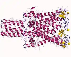 - ↑ Bass, R. B.; Strop, P.; Barclay, M.; Rees, D. (2002). "Crystal structure of Escherichia coli MscS, a voltage-modulated and mechanosensitive channel" (PDF). Science. 298 (5598): 1582–1587. Bibcode:2002Sci...298.1582B. doi:10.1126/science.1077945. PMID 12446901. S2CID 15945269.