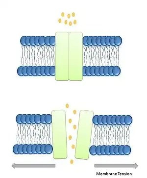 - ↑ Sachs, F; Morris, C. E (1998). "Mechanosensitive ion channels in nonspecialized cells". Reviews of Physiology, Biochemistry and Pharmacology. 132: 1–77. doi:10.1007/BFb0004985. ISBN 978-3-540-63492-8. PMID 9558913.