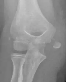 - ↑ Edmonds, Eric W (2010). "How Displaced Are "Nondisplaced" Fractures of the Medial Humeral Epicondyle in Children? Results of a Three-Dimensional Computed Tomography Analysis". Journal of Bone and Joint Surgery. 92 (17): 2785–2791. doi:10.2106/JBJS.I.01637. ISSN 0021-9355. PMID 21123608.