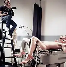 An intimate examination can form part of a scene in medical play where the nurse or doctor (or even or a nun)[1] inflicts one or more embarrassing and humiliating quasi-medical procedures on the patient. Often, frozen or heated objects are introduced to the patient's body to simulate the uncomfortable sensations that can occur during a real examination. Examinations may include an examination and intrusion of the anus, urethra, or vagina, as well as handling and manipulation of the penis, testicles, clitoris, and nipples. Quite often, strap-on play is also incorporated, as this can heighten the intimacy and the sensations of the "patient" (recipient). This may be a prelude to masturbation or administration of an enema. Before examination, the patient can be placed in physical restraints and gagged, and wear some form of embarrassing clothing.