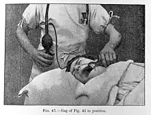 • Whitehead gag: invented in 1877 by Walter Whitehead (1840-1913), a surgeon in Manchester, England,[1] consists of two hinged metal frames that wrap around the front of the patient's head and which have sections bent to fit between the front teeth. When spread apart, the frames separate the jaws, holding the mouth open. The desired degree of separation is set and maintained by a ratchet mechanism on each side of the frame.