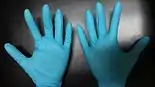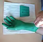 Medical gloves are disposable gloves used during medical examinations and procedures to help prevent cross-contamination between caregivers and patients.[1] Medical gloves are made of different polymers including latex, nitrile rubber, polyvinyl chloride and neoprene; they come unpowdered, or powdered with corn starch to lubricate the gloves, making them easier to put on the hands.[2]