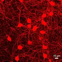 Confocal microscopy Z projection of medium spiny neurons (MSNs) in the mouse striatum. The neurons were labeled using the matrisome MSN mouse Gpr101-Cre[7] in combination with a dtTomato (red fluorescent protein) reporter. A 3D projection of the same neurons can be viewed here.