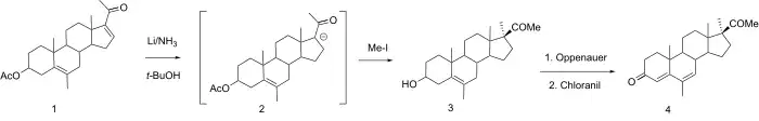 The acetate group is lost as a side reaction. In an interesting modification on the usual scheme, (3) is treated with aluminum isopropoxide and a ketone (Oppenauer conditions) as well as chloranil in a single reaction; the 4,6-diene, (medrogesterone), is obtained directly from this step.