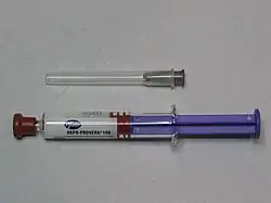 DMPA, under brand names such as Depo-Provera and Depo-SubQ Provera 104, is used in hormonal birth control as a long-lasting progestogen-only injectable contraceptive to prevent pregnancy in women.[43][44] It is given by intramuscular or subcutaneous injection and forms a long-lasting depot, from which it is slowly released over a period of several months. It takes one week to take effect if given after the first five days of the period cycle, and is effective immediately if given during the first five days of the period cycle. Estimates of first-year failure rates are about 0.3%.[45] MPA is effective in preventing pregnancy, but offers no protection against sexually transmitted infections (STIs).