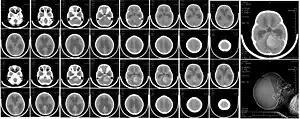 CT scan, showing a tumorous mass in the posterior fossa, giving rise to obstructive hydrocephalus, in a six-year-old girl