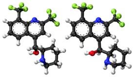 Mefloquine is a chiral molecule with two asymmetric carbon centres, which means it has four different stereoisomers. The drug is currently manufactured and sold as a racemate of the (R,S)- and (S,R)-enantiomers by Hoffman-LaRoche, a Swiss pharmaceutical company. Essentially, it is two drugs in one. Plasma concentrations of the (–)-enantiomer are significantly higher than those for the (+)-enantiomer, and the pharmacokinetics between the two enantiomers are significantly different. The (+)-enantiomer has a shorter half-life than the (–)-enantiomer.[15]