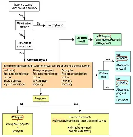 Mefloquine is useful for the prevention of malaria in all areas except for those where parasites may have resistance to multiple medications,[12] and is one of several anti-malarial medications recommended by the United States Centers for Disease Control and Prevention for this purpose. It is also recommended by the Infectious Disease Society of America for malaria prophylaxis as a first or second-line agent, depending on resistance patterns in the malaria found in the geographic region visited.[13][14] It is typically taken for one to two weeks before entering an area with malaria.[10] Doxycycline and atovaquone/proguanil provide protection within one to two days and may be better tolerated.[15][16] If a person becomes ill with malaria despite prophylaxis with mefloquine, the use of halofantrine and quinine for treatment may be ineffective.[17]: 4