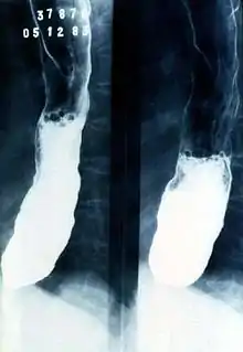 Megaesophagus, also known as esophageal dilatation, is a disorder of the esophagus in humans and other mammals, whereby the esophagus becomes abnormally enlarged. Megaesophagus may be caused by any disease which causes the muscles of the esophagus to fail to properly propel food and liquid from the mouth into the stomach (that is, a failure of peristalsis). Food can become lodged in the flaccid esophagus, where it may decay, be regurgitated, or maybe inhaled into the lungs (leading to aspiration pneumonia).[1]