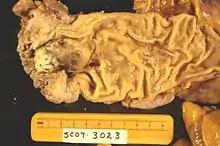 One method is the "ugly duckling sign".[69] Correlation of common lesion characteristics is made. Lesions that deviate from the common characteristics are labeled an "Ugly Duckling", and a further professional exam is required. The "Little Red Riding Hood" sign[69] suggests that individuals with fair skin and light-colored hair might have difficult-to-diagnose amelanotic melanomas. Extra care is required when examining such individuals, as they might have multiple melanomas and severely dysplastic nevi. A dermatoscope must be used to detect "ugly ducklings", as many melanomas in these individuals resemble non-melanomas or are considered to be "wolves in sheep's clothing".[70] These fair-skinned individuals often have lightly pigmented or amelanotic melanomas that do not present easy-to-observe color changes and variations. Their borders are often indistinct, complicating visual identification without a dermatoscope.