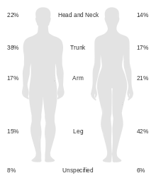 Melanoma is the most dangerous type of skin cancer.[2] Globally, in 2012, it newly occurred in 232,000 people.[2] In 2015, there were 3.1 million people with active disease, which resulted in 59,800 deaths.[5][6] Australia and New Zealand have the highest rates of melanoma in the world.[2] There are also high rates in Northern Europe and North America, while it is less common in Asia, Africa and Latin America.[2] In the United States melanoma occurs about 1.6 times more often in men than women.[10] Melanoma has become more common since the 1960s in areas mostly populated by people of European descent.[2][8]