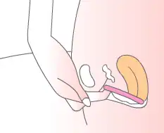 Ring-shaped cups (also called menstrual discs or menstrual rings) are inserted differently than bell-shaped cups: by squeezing opposite sides of the rim together until they touch, sliding the inner end of the folded cup to the end of the vaginal canal, and tucking the outer end behind the pubic bone.[34][11] They can be less bulky than a bell-shaped cup, no bulkier than a tampon.[24] Ring-shaped cups have to be placed further in, and it requires more knowledge of anatomy to get them under and around the cervix,[15] not rucked up in front of it.[39] Ring-shaped cups with non-circular rims are designed to be inserted with the widest, deepest part going in first. If they are inserted the wrong way around they may leak.[28][40] If there are stems or other removal aids, they should be on the end inserted last.[34]
