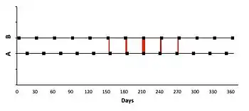 Both Wilson[14] and Arden and Dye[64] pointed out that menstrual synchrony can occur by chance when there is menstrual cycle variability. Yang and Schank[6] argued that when there is cycle variability (i.e., either women have irregular cycles, have cycles of different frequencies, or both), most women will have the opportunity to experience synchrony even though it is a result of cycle variability and not a result of a mechanism such as the exchange of pheromones. For example, consider two women A and B. Suppose A has menstrual cycles that are 28 days long and B has cycles that are 30 days long. Suppose further that when A and B become close friends, B has a cycle onset 14 days before A's next onset. The next time both of them have menstrual cycle onsets, B will have a cycle onset 12 days before A. B will continue to gain two days on A until their onsets coincide, then their cycles will begin to diverge again. The cycles of A and B will repeatedly converge and diverge creating the appearance of synchrony during convergence. This is a mathematical property of cycles of different frequencies and not due to the interaction of A and B.[6] If, in addition, the duration of menstruation is considered (typically 3 to 5 days with a range of 2 to 7 days[65]), then the experience of synchrony may last a number of months.[6]