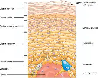 - ↑ Morrison KM, Miesegaes GR, Lumpkin EA, Maricich SM (December 2009). "Mammalian Merkel cells are descended from the epidermal lineage". Developmental Biology. 336 (1): 76–83. doi:10.1016/j.ydbio.2009.09.032. PMC 2783667. PMID 19782676.